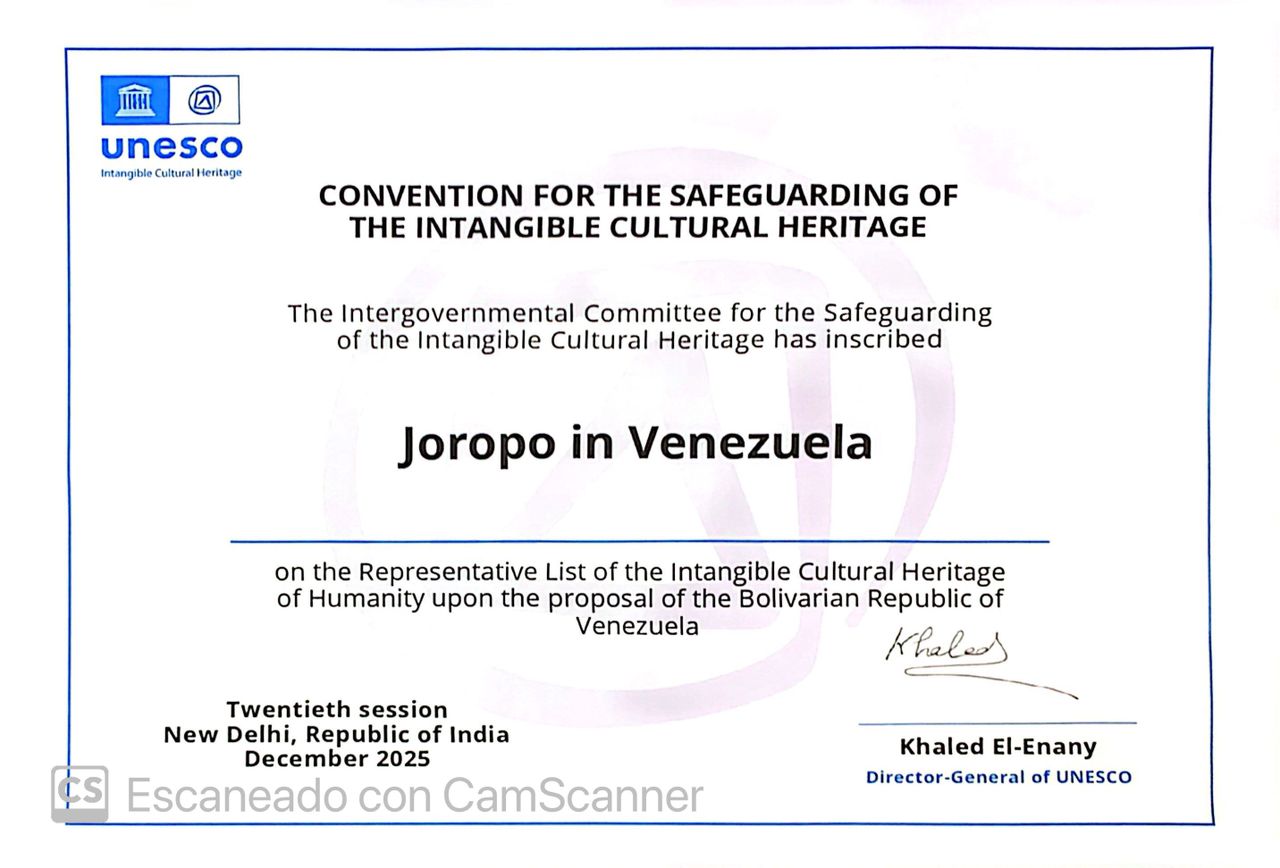 En el marco de la referida actividad, el Joropo venezolano, en todas sus variedades, quedó oficialmente inscrito en la Lista del Patrimonio Cultural Inmaterial de la Humanidad, correspondiéndole a la embajadora de Venezuela en la India, Capaya Rodríguez González, en su condición de jefa de Delegación, pronunciar unas palabras alusivas a tan importante decisión de la UNESCO, en nombre del Presidente Nicolás Maduro Moros; la vicepresidenta Delcy Rodríguez Gómez, y el ministro del Poder Popular para la Cultura, Ernesto Villegas Poljak.