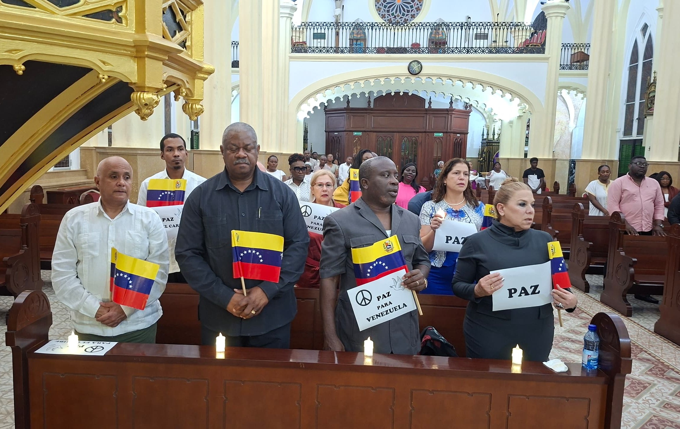 Los fieles participantes en la eucaristía portaron carteles en favor de la paz, banderas de Venezuela y una vela encendida para acompañar de manera activa las oraciones en favor de los deseos de concordia para la Patria de Bolívar.