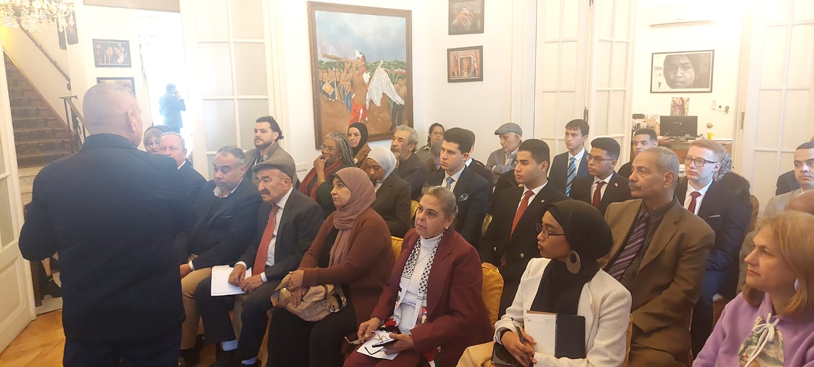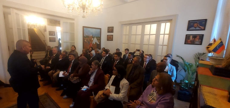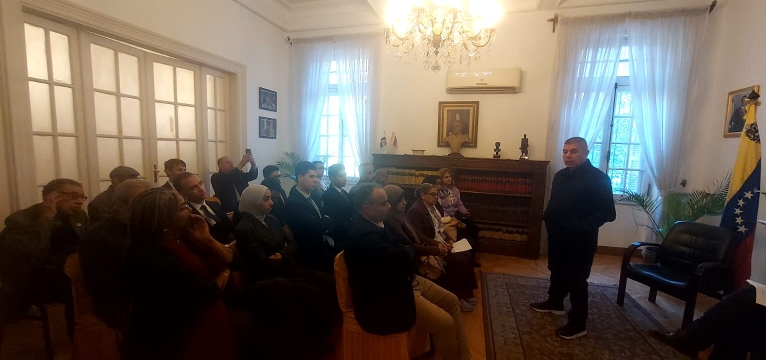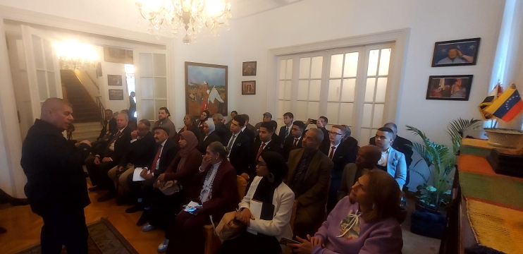 El Cairo, 21 de diciembre de 2025.- Para mantener informados acerca de la situación de asedio por parte de los Estados Unidos de América (EEUU) contra Venezuela y la paz y la estabilidad del Caribe, la Embajada del país suramericano en Egipto reunió a representantes de movimientos sociales, partidos políticos y estudiantes para denunciar la nueva y peligrosa escalada de agresión norteamericana, que ahora recurre a la piratería marítima y a declaraciones coloniales para intentar apoderarse de los recursos del pueblo venezolano.