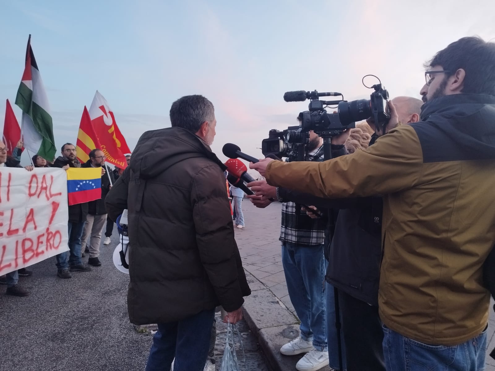 Nápoles, 5 de enero de 2026.- Más de 200 participantes de grupos de solidaridad con la Revolución Bolivariana y movimientos sociales se dieron cita ante la sede del Consulado General de los Estados Unidos (EEUU) en la ciudad de Nápoles, Italia, para exigir la inmediata liberación del Presidente de Venezuela, Nicolás Maduro, y la Primera Combatiente Cilia Flores.