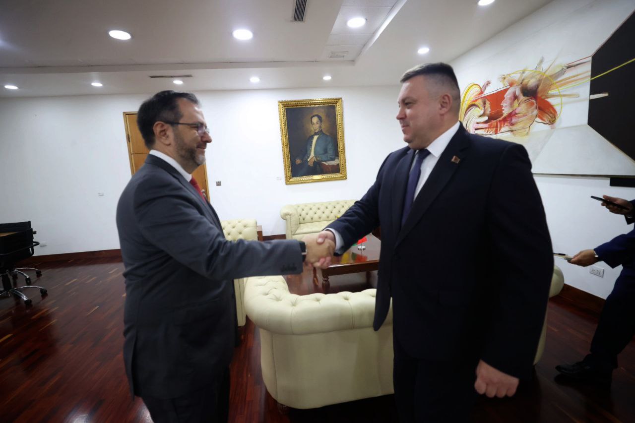El ministro del Poder Popular para Relaciones Exteriores, Yván Gil, sostuvo este viernes un cordial encuentro con el embajador de Belarús en Venezuela, Dmitri Derevinski, en el que agradeció al Presidente Aleksandr Lukashenko por su firme postura en defensa de la soberanía venezolana.