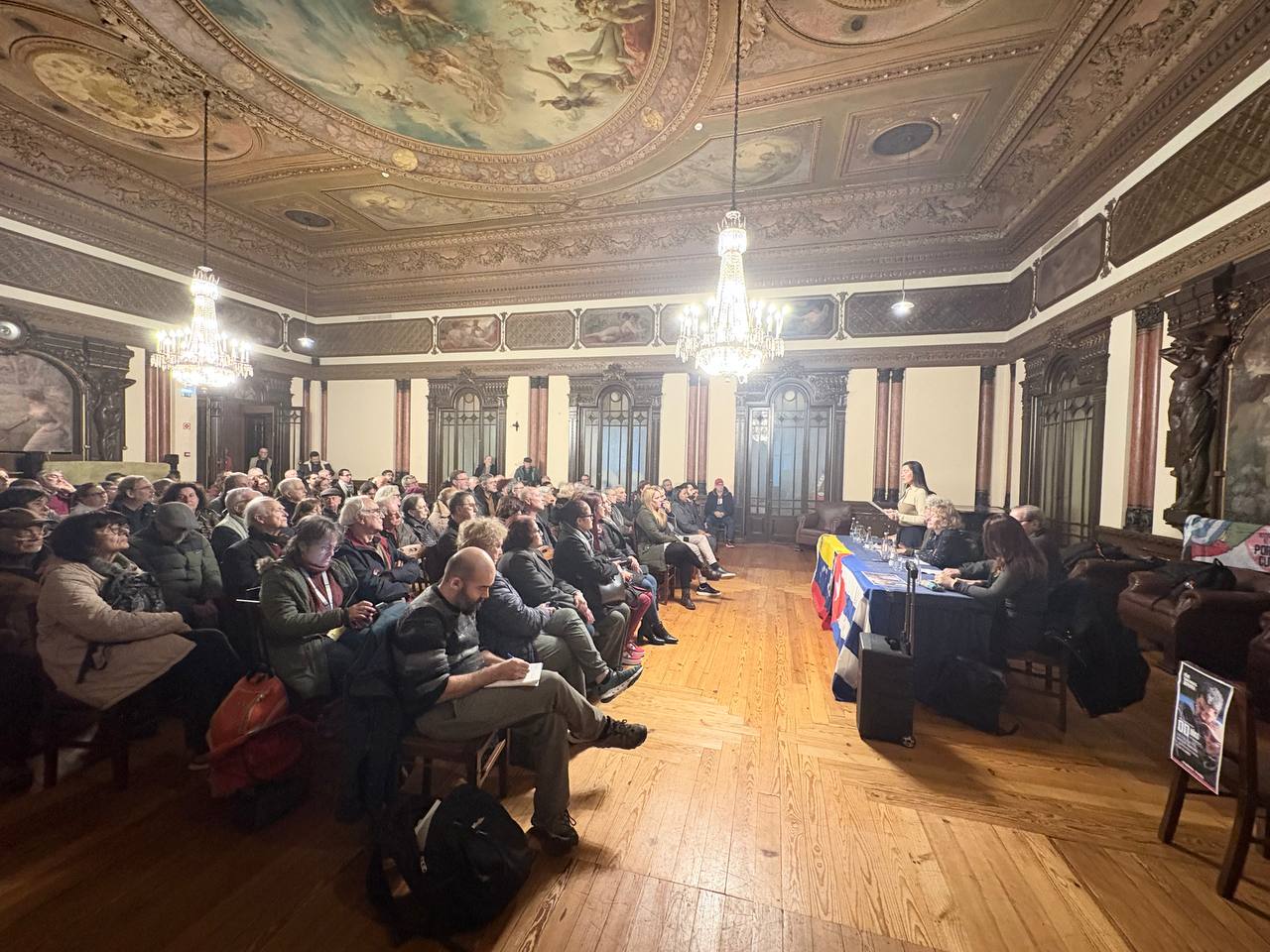 Lisboa, 13 de enero de 2026.- La solidaridad internacional sigue manifestándose en Portugal. El Consejo Portugués para la Paz y la Cooperación (CPPC) y la Asociación de Amistad Portugal-Cuba (AAPC) convocaron una sesión pública en la histórica Casa do Alentejo, en Lisboa, bajo el lema “Fin a la agresión de los Estados Unidos (EEUU) a Venezuela”.
