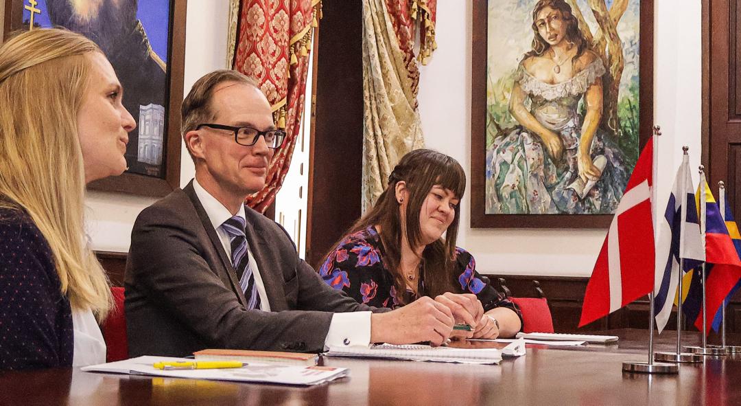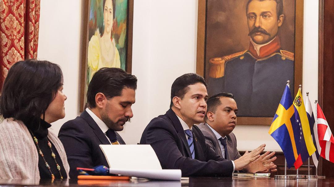 El director general para Europa, del Despacho del Viceministro para Europa y America del Norte, Omar Berroterán, sostuvo este miércoles un encuentro diplomático con una delegación de los jefes de misión adjuntos del Reino de Suecia, Helmer Broberg; Reino de Dinamarca, Nana Hein Winther; y la República de Finlandia, Henna Mäki-Mantila; concurrentes ante Venezuela desde sus residencias en Bogotá, Colombia.