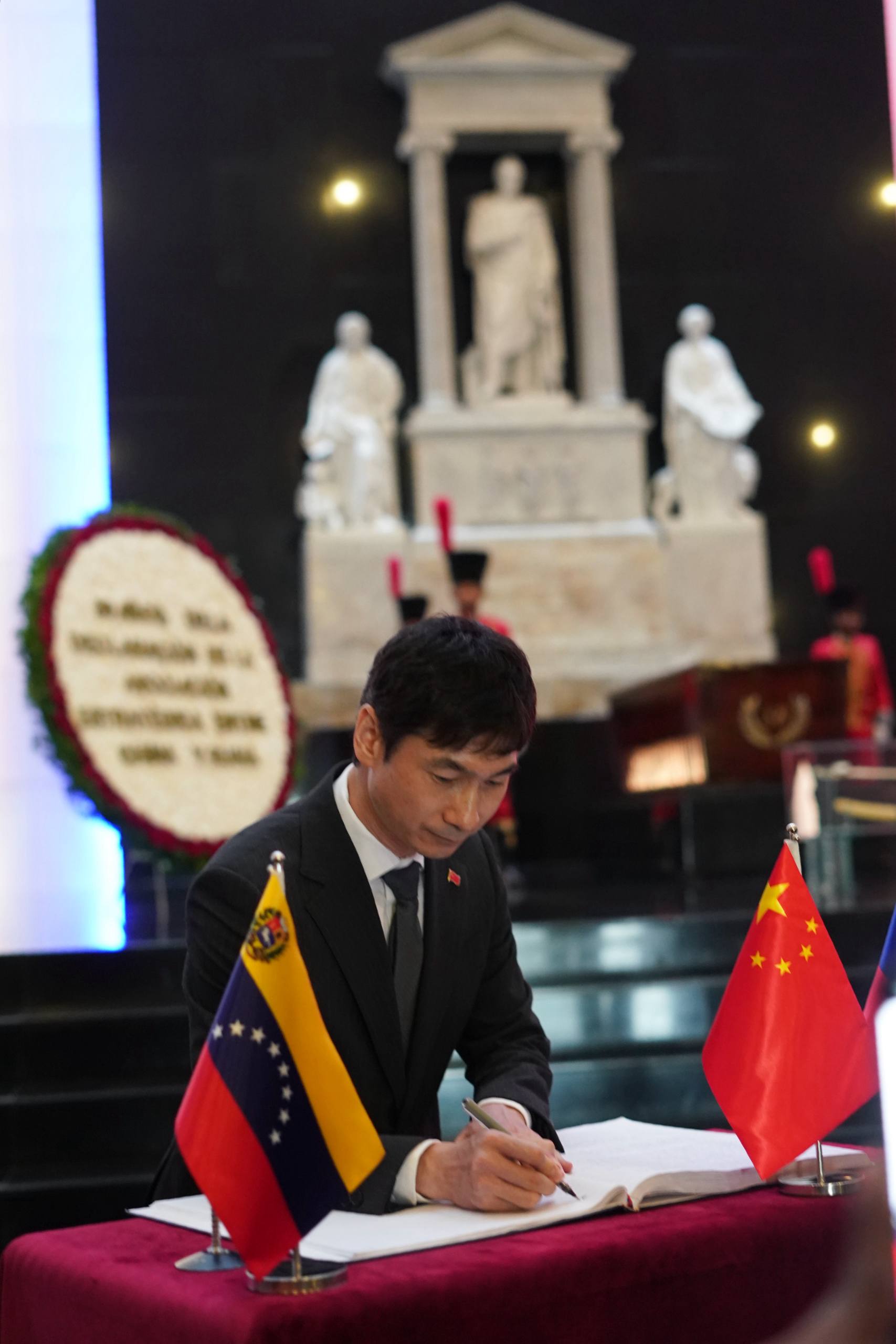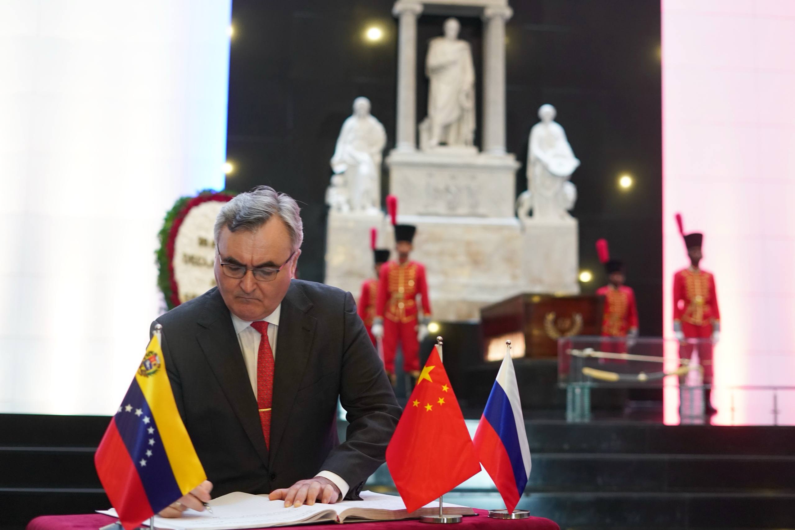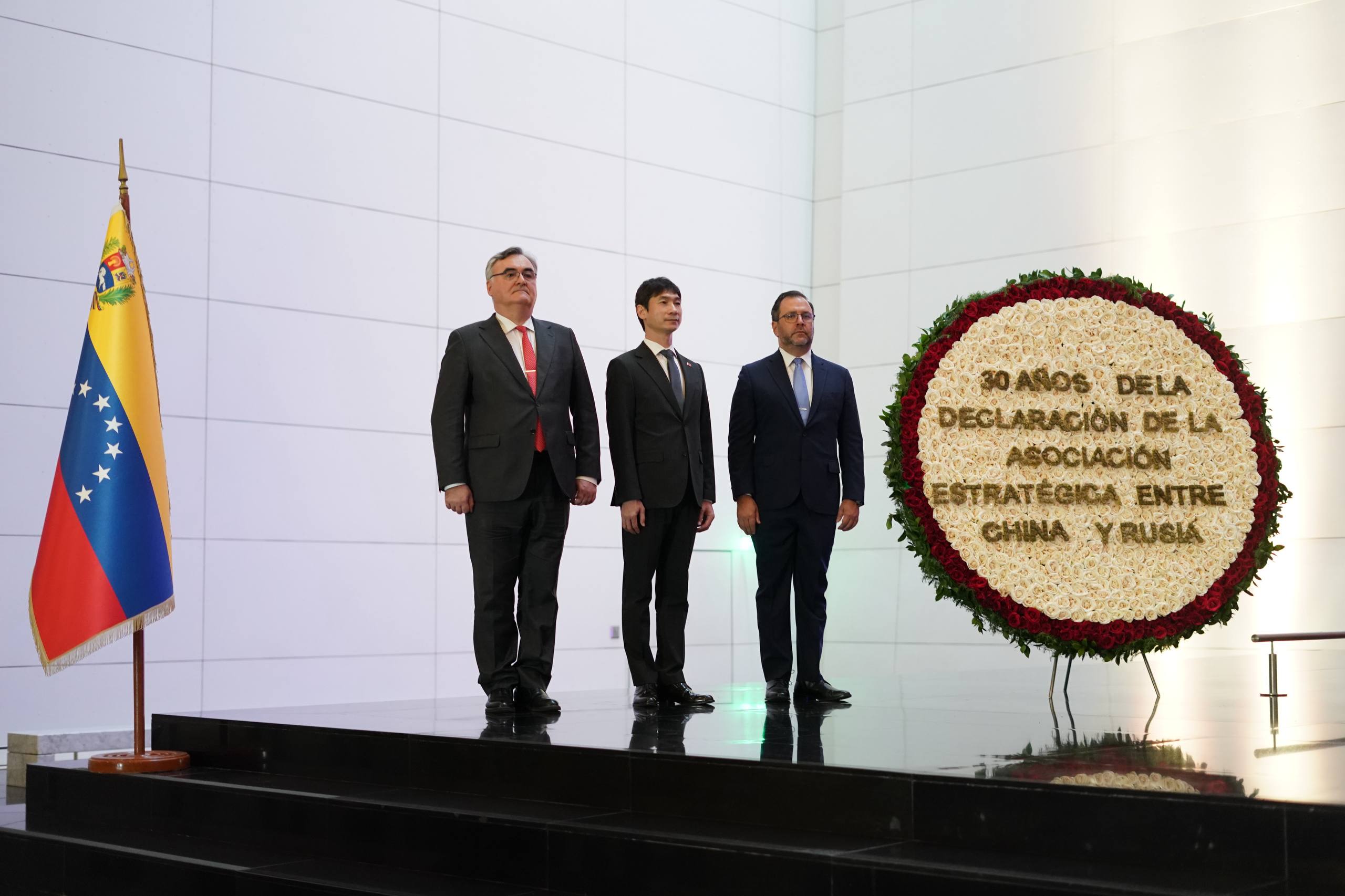El ministro del Poder Popular para Relaciones Exteriores, Yván Gil, en nombre del Gobierno de la República Bolivariana de Venezuela, acompaño este martes la celebración del 30 Aniversario de la Declaración de la Asociación Estratégica entre la República Popular China y la Federación de Rusia, con una ofrenda floral ante el sarcófago que guarda los restos mortales del Libertador Simón Bolívar, en el Panteón Nacional, en Caracas.